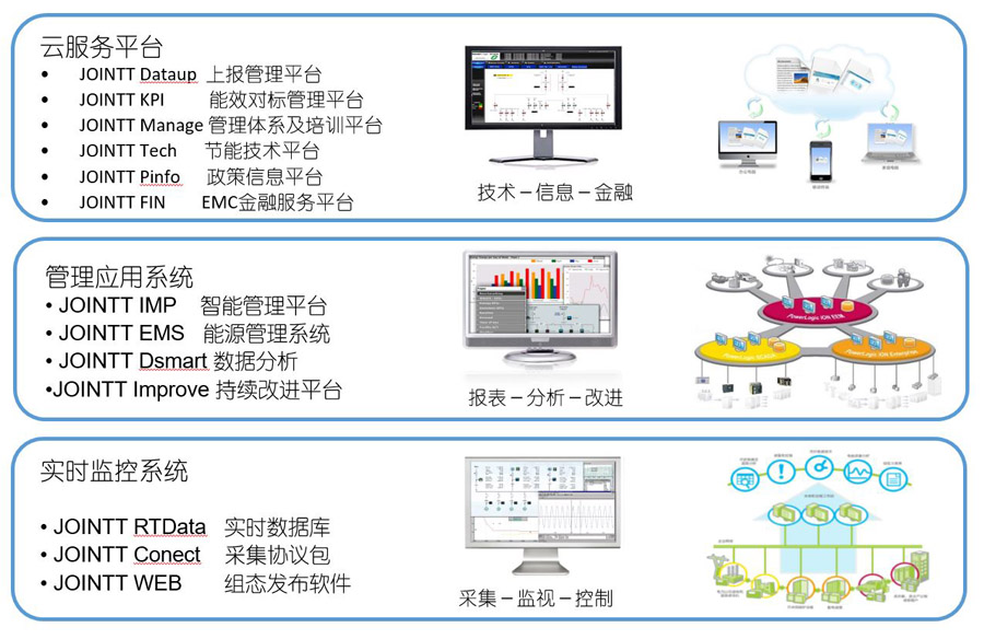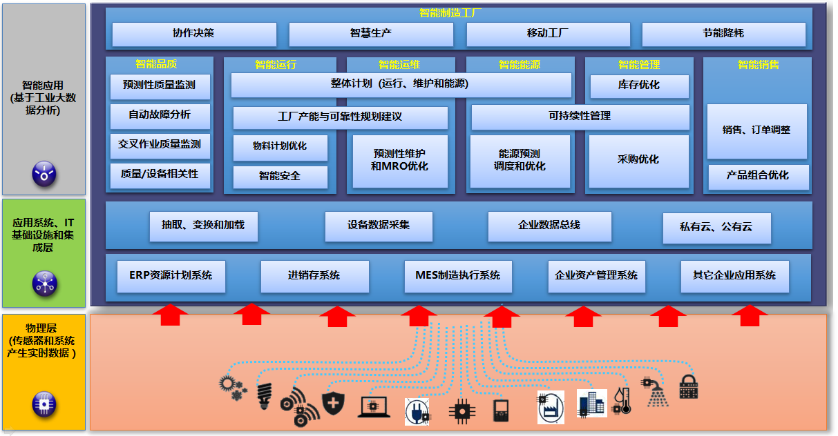 接點智能工廠整體解決方案包括三個主要層級功能:實時監控層、應用分析層與云服務層,三層的主要功能架構及技術產品如下圖: